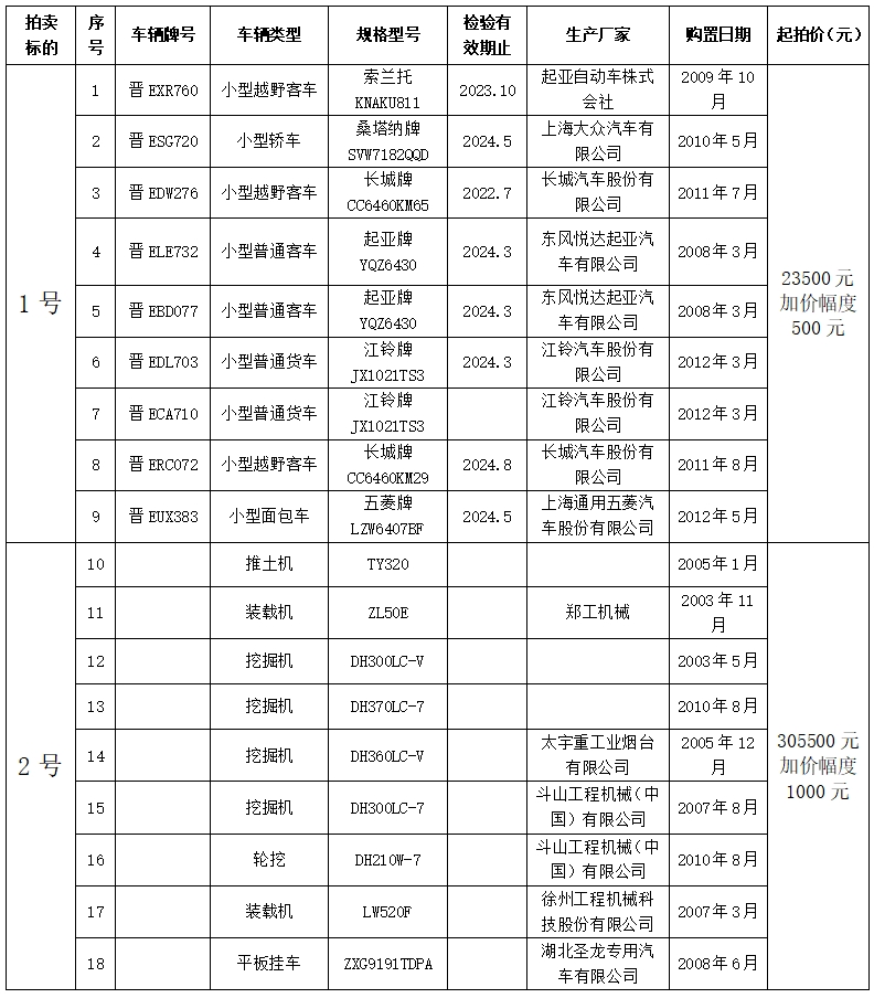1號標(biāo)的:小型越野客、貨車、轎車等9輛(明細(xì)附后)